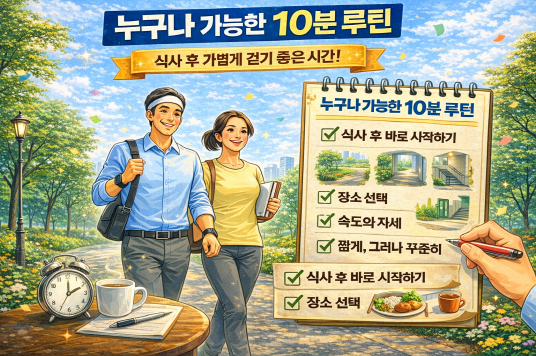 건강을 지키는 방법은 거창하지 않습니다. 점심시간에 잠깐 자리를 벗어나 걷는 것만으로도 소화가 잘 되고, 머리가 맑아지며, 스트레스가 줄어듭니다. 하루 10분의 걸음이 쌓이면 체력은 물론 마음의 균형까지 회복됩니다.