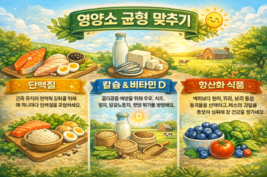 - 칼슘과 비타민 D: 골다공증 예방을 위해 우유, 치즈, 멸치, 달걀노른자, 햇볕 쬐기 등을 병행하세요.
