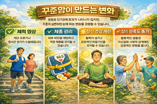 운동은 단기간에 효과가 나타나지 않지만, 꾸준히 실천하면 눈에 띄는 변화를 경험할 수 있습니다.