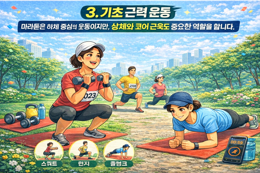 마라톤은 하체 중심의 운동이지만, 상체와 코어 근육도 중요한 역할을 합니다. 스쿼트, 런지, 플랭크 같은 간단한 근력 운동을 통해 근육의 밸런스를 맞추고, 자세를 안정적으로 유지할 수 있도록 도와줍니다. 특히 플랭크는 복부와 허리 근육을 강화해 장시간 달릴 때 자세가 무너지지 않도록 해줍니다.